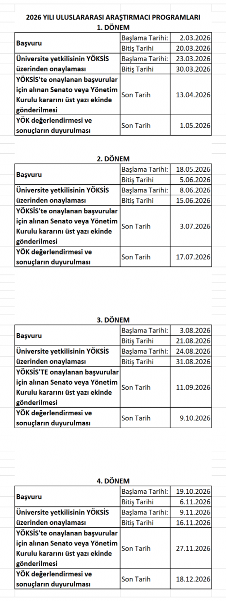 YükseköğretimKurulu tarafından doktora öğrencileri ve öğretim üyelerinin dünyanın seçkinüniversitelerinde uluslararası standartlarda araştırma yapmalarını teşvik etmekamacıyla başlatılan “Uluslararası Araştırmacı Programları” kapsamda, 2026 YılıBaşvuruları 4 (dört) dönem şeklinde alınacak olup ayrıntılı bilgi aşağıda yealmaktadır.
